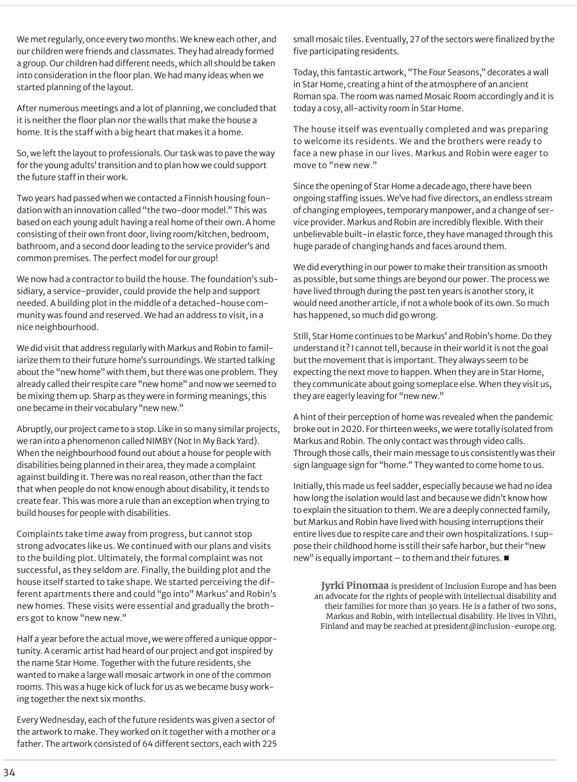 - Tsekkiläisen Kaarlen yliopiston professori Jan Šiška ja hänen kollegansa Janet Stewart Minnesotan yliopistosta Yhdysvalloista pyysivät minua kirjoittamaan Minnesotan yliopiston Impact Magazine -julkaisuun artikkelin kahden kehitysvammaisen poikamme, Markuksen ja Robinin kymmenen vuotta sitten tapahtuneesta muutosta lapsuuden kodistaan omiin koteihinsa. Olen kirjoittanut artikkelin englanniksi keväällä 2022 ja se julkaistiin elokuussa 2022 Impact Magazine’n kehitysvammaisten ihmisten siirtymistä aikuisuuteen käsittelevässä teemanumerossa. Tässä artikkelin suomenkielinen versio ja alkuperäistä artikkelia runsaammin kuvamateriaalia.
