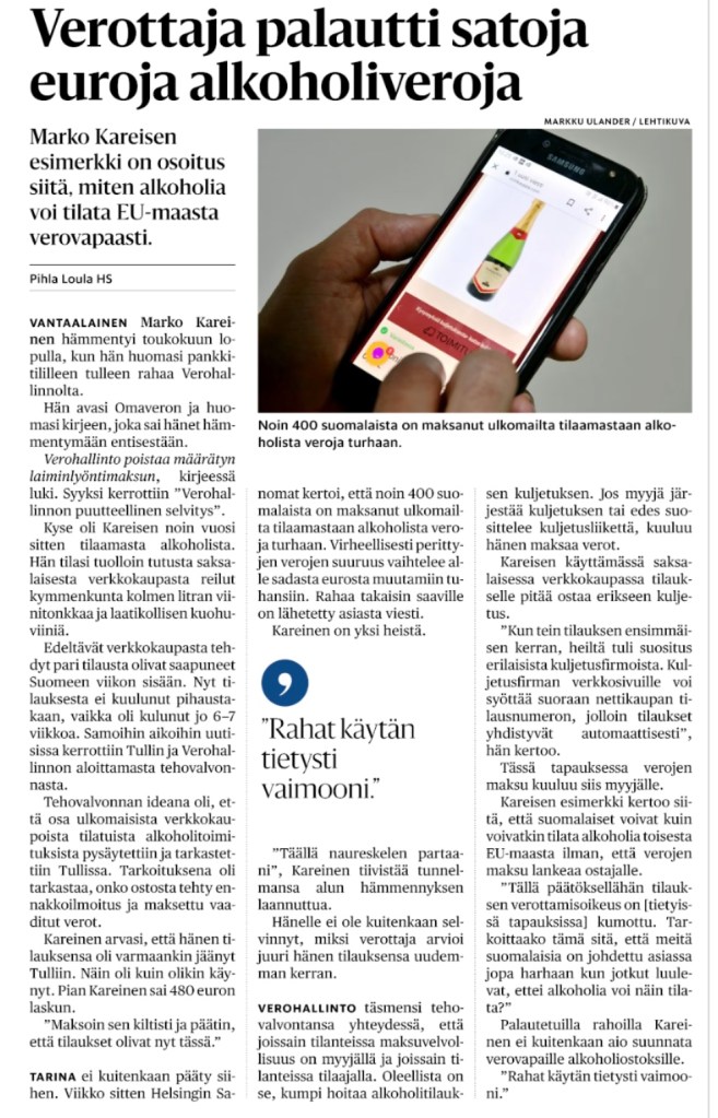 Kuluvan marraskuun alussa Suomen Tulli ja Verohallinto aloittivat operaation, jonka tarkoituksena on saada rajan yli kuluttajille yhä vuolaampana virtana kulkevasta alkoholituotteiden paljoudesta valmiste- ja juomapakkausverot Suomeen. Operaation kohteena on ulkomaisista verkkokaupoista ostettu ja Suomen rajan yli kuljetusyritysten matkassa kuljetettava alkoholi.