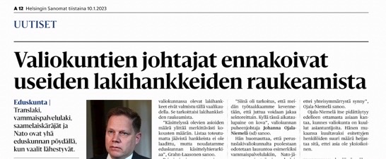 Alkaa vähitellen todella näyttää siltä, että eduskunnalta aika loppuu. Markus Lohi tuossa Helsingin Sanomille pohti, josko Perustuslakivaliokunnan muutosvaatimukset olisivat niin laajoja, ettei Sosiaali- ja terveysvaliokunta ehtisi niitä tekemään.