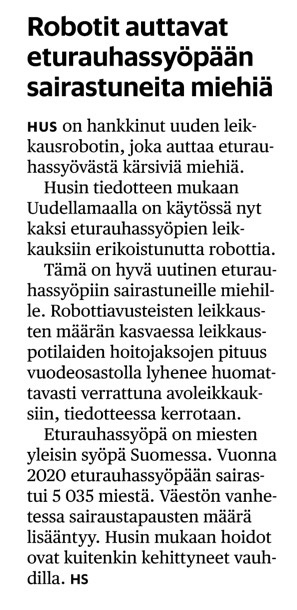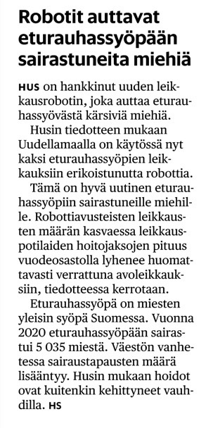 Paikallisen eturauhassyövän hoidossa RALP eli robottiavusteinen laparoskooppinen radikaaliprostatektomia on vakiintunut menetelmä, joka on käytössä neljässä yliopistosairaalassa. Laitteisto sisältää erillisen ohjauskonsolin, mikä mahdollistaa ergonomisen työskentelyn. Optiikka luo kolmiulotteisen näkymän ja 10 – 15-kertaisen suurennoksen, mikä puolestaan mahdollistaa tarkan työskentelyn. Toimenpiteestä toipuminen on nopeampaa ja verensiirtojen määrä vähäisempi kuin avoimessa radikaaliprostatektomiassa. Onkologisissa tuloksissa ei ole eroa menetelmien välillä. Radikaaliprostatektomia on tekniikasta riippumatta vaativa leikkaus, jossa kirurgin taito ja kokemus ratkaisevat lopputuloksen. Robottiavusteiseen laparoskooppiseen radikaaliprostatektomiaan soveltuu suurin osa niistä potilaista, joille suunnitellaan avointa radikaalia prostatektomiaa. da Vinci -laitteiston hankintahinta ja käyttökustannukset ovat huomattavat.Lähde: http://www.duodecimlehti.fi