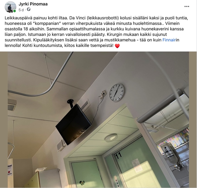 Kiitollinen olen myös terveydenhuollostamme. Erikoissairaanhoidosta. Jokaikisestä ihmisestä, joka on tänään hoitooni ja tämän päivän leikkaukseen tavalla tai toisella osallistunut. Ystävällisiä ja hyviä ihmisiä. Alansa ammattilaisia. Huippuosaajia.