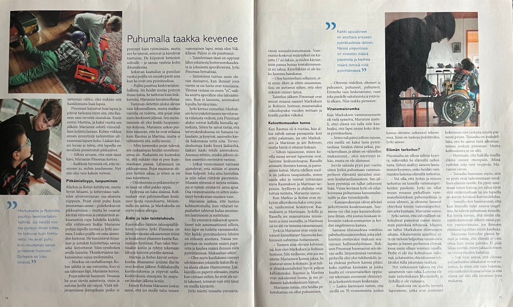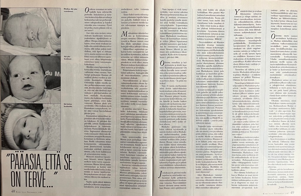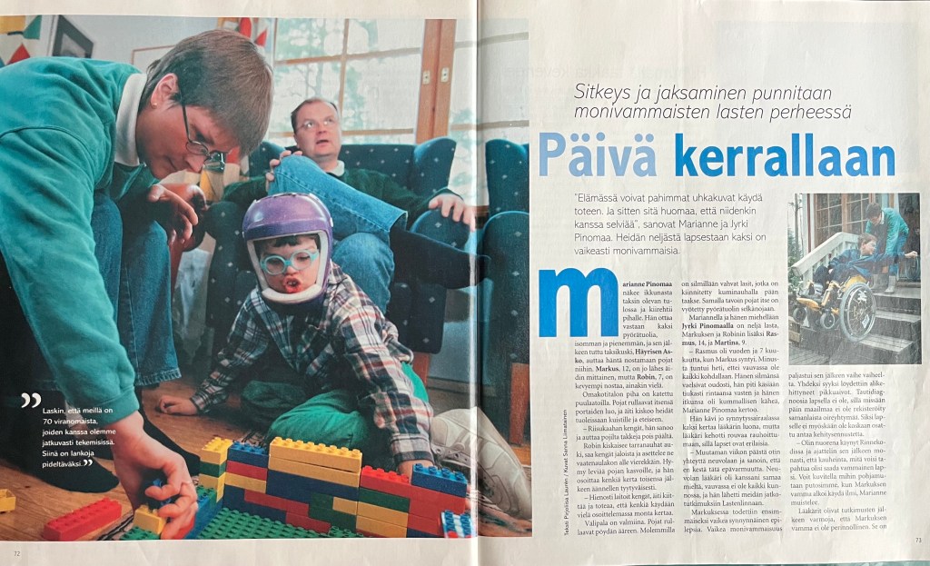 Kaks plus 5 / 1987 – kuvissa MarkusTidningen Folkhälsan 3/1991 – i bilden Markus 5 årTidningen Folkhälsan 3/1992 – i bilden Markus 6 årTidningen Folkhälsan 1/1993 – i bilderna Markus 7 årKodin kuvalehti 17.6.1999Apu 13.8.1999Tukilinja, helmikuu-maaliskuu/2007Kivenjuuret-lehti 2007 – Stenrothien suksuseuran julkaisu – alempana olevat kaksi artikkelia samasta julkaisustaKivenjuuret-lehti 2007Kivenjuuret-lehti 2007CP-lehti 4/2024