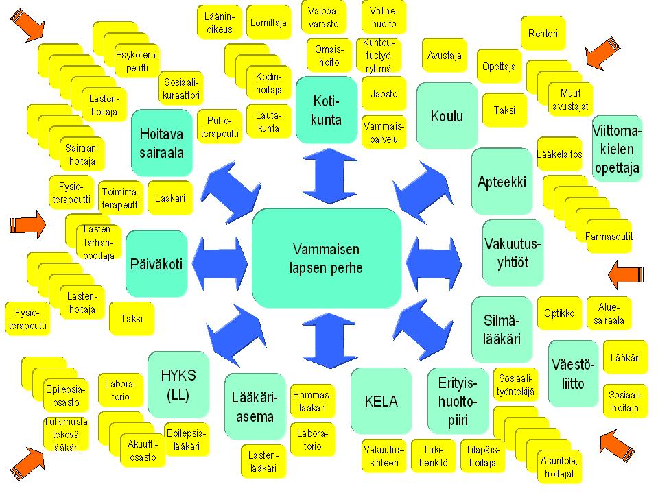Vammaisen lapsen perheen auttamiseksi tarkoitetut palvelut kuuluvat kunnan tai kuntayhtymän organisaatiossa useamman palvelulinjan ja keskuksen vastuulle. Parhaimmillaan ne ovat kokonaisuus, jonka eri osat tukevat ja täydentävät toisiaan. Hyvä ja toimiva palvelukokonaisuus voi silloin syntyä vain palvelujen järjestämisvastuussa olevien eri palvelulinjojen saumattoman yhteistyön tuloksena ja sovittamalla se jokaisen asiakkaan omaan ja erityiseen ekokulttuuriseen ympäristöön.