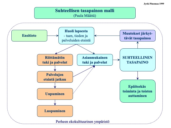 Paula Määttä puhuu kirjassaan suhteellisen tasapainon mallista. Kun perhe saa asianmukaista tukea ja palveluja, perhe saavuttaa ns. suhteellisen tasapainon. Lopullinen tasapaino ei voi ollakaan, sillä jokaisessa perheessä tapahtuu ennakoimattomia muutoksia, jolloin tasapaino järkkyy ja palataan ikään kuin lähtöruutuun. Jos palvelu ei vastaa perheen tarpeita eikä auta perheen arjen sujumista, seuraa vähitellen perheen uupuminen ja luopuminen. Tilannetta selkiyttää oheinen Paula Määtän luvalla muokkaamani kaavio hänen esittämästään suhteellisen tasapainon mallista. (Kaavio 2.)
